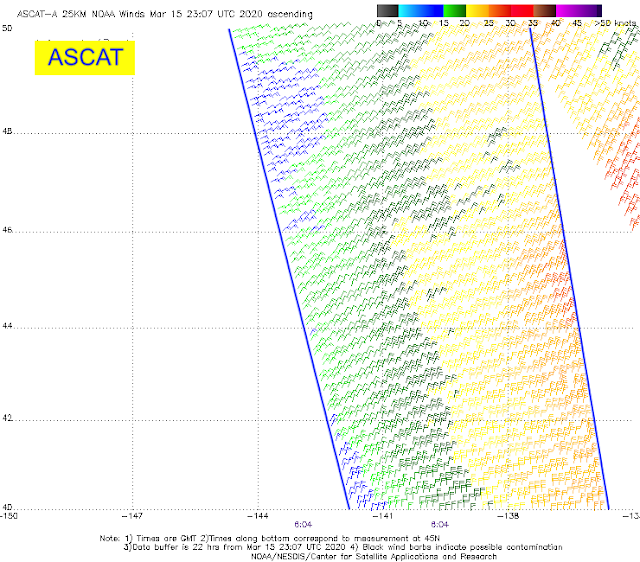 Wind speeds are a bit harder to read in the KNMI data as they include a cloud overlay and the color codes are tied to the Beaufort Force scale. The green arrows are the ECMWF model forecasts for the times of the satellite data, which is another neat feature of this display. We should not be too surprised by the general agreement observed as the ASCAT winds are used to seed the model runs.